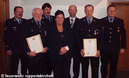 Ehrung für 40 Jahre aktive Dienstzeit bei der Feuerwehr Ruppertskirchen: von links Kreisbrandrat Johann Wild, Alfons Büchner, Kommandant Georg Stadler, Landrätin Bruni Mayer, Bürgermeister Alfons Sittinger, Michael Eder und Vorstand Robert Lindner. Arnstorf. „Ihr seid vorbildlich in der Nachwuchsarbeit!“ Darin waren sich alle Ehrengäste der Dienst- und Mitgliederversammlung der Feuerwehr Ruppertskirchen einig. Sowohl Bürgermeister Alfons Sittinger wie auch Landrätin Bruni Mayer und Kreisbrandrat Johann Wild zollten den Verantwortlichen ein dickes Lob für hervorragendes Engagement im Jugendbereich, aber auch für den Ausbildungsstand, Einsatzbereitschaft und die gesellschaftlichen Aktivitäten. Spontanen Beifall gab’s im Gasthaus Stegmüller für die Zusicherung des Bürgermeisters, zum 125-jährigen Gründungsjubiläum von 2. bis 4. Juli 2010 ein neues Einsatzfahrzeug in Dienst zu stellen. Vorstand Robert Lindner, der für weitere sechs Jahre im Amt bestätigt wurde, hatte bei seinem Bericht die Vielzahl gesellschaftlicher Aktivitäten Revue passieren lassen. Unter anderem erinnerte er an Ausflüge und die Florianifeier, an Faschingsabende und einen Operettenbesuch, an die Teilnahme an Garten-, Hallen- und Gründungsfesten, an den Kameradschaftsabend und das gute Ergebnis der Christbaumfeier. Kommandant Georg Stadler, der ebenfalls wiedergewählt wurde, hatte fünf Einsätze für das vergangene Jahr vermerkt, dazu drei Unterrichtsabende, zwölf Übungen, drei Funkübungen und zwei Prüfungen für Leistungsabzeichen. Seinen Männern dankte er für die Bereitschaft zur Gruppenführer- und Sprechfunkausbildung, zwei Tage Einsatz beim Mittelalterfest und das Engagement für den „Kater“-Einsatzwagen. „18 Unterrichtsabende, zehn Trainingseinheiten für den Kreisjugendwettkampf, Engagement für die Aktion „Drei Tage Zeit für Helden“, ein Ferienprogramm mit Zeltlager, bestes Abschneiden beim Wissenstest, Abholung des Friedenslichtes und Faschingswagenbau“, zählte der wiedergewählte Jugendwart Anton Stadlbauer unter anderem in seinem Bericht über die vielfältigen Aktivitäten seiner Schützlinge auf. Mit 20 jungen Leuten, darunter sechs Mädchen, habe Ruppertskirchen im Landkreis derzeit die zweitgrößte Nachwuchsgruppe. Stolz darf die Wehr auch auf ihre fünf Atemschutzträger sein, für die Anton Stadlbauer weiterhin zuständig ist. Von Kassier Josef Büchner erfuhr die Versammlung, wie es um die Finanzen bestellt ist, dass 53 Männer aktiv im Dienst stehen und dass durch sechs Neuaufnahmen die Gesamtzahl der Mitglieder auf 246 angestiegen ist. Auch Büchner wurde wieder zum Finanzverwalter bestellt. Bei den Neuwahlen wurde Anton Stadlbauer ebenso als 2. Kommandant bestätigt wie Alois Ger-wallner als 2. Vorsitzender und Franz Eberl als Schriftführer. Gerätewart Hans Karg erhält künftig Unterstützung von Andreas Stadler. Als Sprecher der Aktiven stellten sich Alfred Maier, Oskar Brunner, Michael Lindner junior und Reinhard Straubinger zur Verfügung. Neue Sprecher der passiven Mitglieder sind Ehrenvorstand Josef Huber, Ehrenkommandant Michael Lindner und Otto Ebenbeck. Schließlich galt es, mit Michael Eder und Alfons Büchner zwei Männer für 40 Jahre aktive Dienstzeit zu Ehren. Mit einem herzlichen Dankeschön überreichte Landrätin Mayer Urkunden und Ehrenzeichen, Bürgermeister Sittinger gratulierte mit Arnstorfer Kräuterlikör. cm