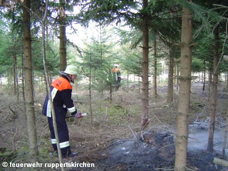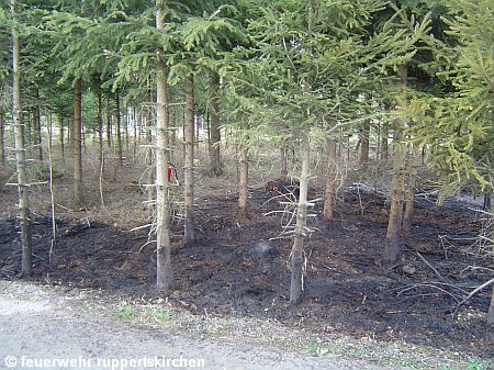Berichte: Waldbrand bei PicklödAm Karfreitag um ca. 16:25 wurden wir durch ein aktives Feuerwehrmitglied zu einem Flächenbrand im Wald bei Picklöd (Straße von Eiselstorf nach Simbach) alarmiert. Unser Feuerwehrkamerad bemerkte eine starke Rauchentwicklung von seinem Hof aus und machte sich mit einem Pulverlöscher auf zum Einsatzort. Da das Feuer mithilfe des Feuerlöschers eingedämmt werden konnte, mussten wir nur die Nachlöscharbeiten durchführen. Mittels Vakuumfässer wurden etwa 15.000 Liter Wasser zur Einsatzstelle geschafft und letzte Brandnester abgelöscht und der Waldboden ausreichend gewässert um eine Brandausbreitung zu verhindern. Der Waldboden war auf etwa 150 m² abgebrannt. Auch der etwa 15-jährige Fichtenbestand wurde in Mitleidenschaft gezogen.