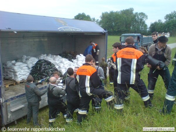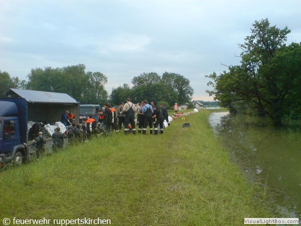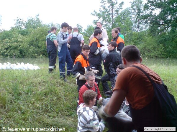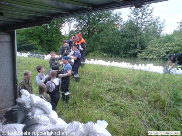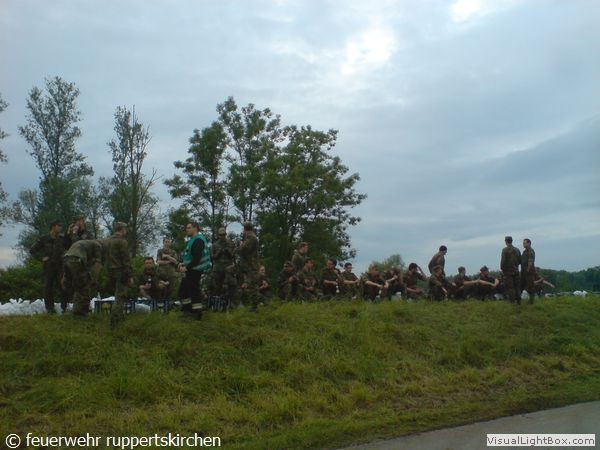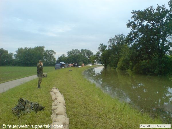 Zusammen mit anderen Kräften von Feuerwehr, Bundespolizei, Bundeswehr und freiwilligen Helfern wurde in unermüdlichem Einsatz der Damm weiter erhöht um die Wassermassen beim Bruch des Vordammes fassen zu können.Der 3. Zug aus unserem Landkreis wurde gegen 21:40 alarmiert und traf ca. um 00:30 in Moos ein und übernahm unsere Arbeit.