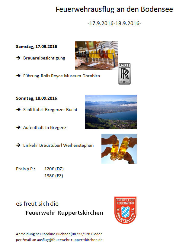 Der FF-Ausflug an den Bodensee wird verschoben auf den 17. und 18. September. Anmeldung weiterhin bei Caroline Büchner oder per Mail an "ausflug@feuerwehr-ruppertskirchen.de".