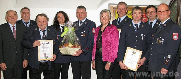 Ehrung für 25 und 40 Jahre aktiven Dienst und Verabschiedung aus der aktiven Truppe: von links 2. Bürgermeister Johann Brunner, Josef Reichl, Ludwig Stapfner, Landes- und Kreisfrauenbeauftragte Andrea Fürstberger, Vorstand Alois Gerwallner, stellvertretende Landrätin Edeltraud Plattner, Robert Stadler, Johann Graser, Kreisbrandmeister Helmut Schaitl und Kommandant Anton Stadlbauer.