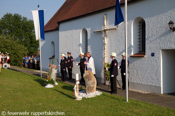 „Zur menschlichen Gemeinschaft gehören das Zueinanderstehen, Verlässlichkeit in Stunden der Gefahr - der Ortsteil Ruppertskirchen lebt von vielen Menschen, die Verantwortung füreinander tragen und da sind, wenn Hilfe gebraucht wird“, betonte Pfarrer Gerhard Auer beim Totengedenken vor der Dorfkirche. Dabei segnete der Priester eine Vereinskerze sowie den neuen Gedenkstein für die verstorbenen Mitglieder seit 1885. Der Stein - mitfinanziert durch eine Spende von Landrätin Bruni Mayer zum Fest - wird einen Ehrenplatz beim Gerätehaus erhalten. Bürgermeister Alfons Sittinger und Vorstand Robert Lindner legten zu Ehren der verstorbenen Kameraden, Freunde und Gönner der Wehr Kränze nieder.