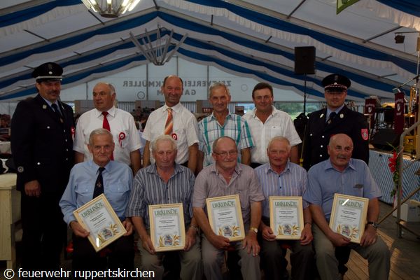 Ehrung langjähriger Mitglieder: sitzend, von links Josef Noneder, Josef Greinsberger, Ignaz Jahrstorfer, Georg Fürstinger und Manfred Gallinger sowie (stehend, von links) Kommandant Georg Stadler, Schirmherr Johann Brunner, Bürgermeister Alfons Sittinger, Theo Henghuber, Georg Neumaier und Vorstand Robert Lindner