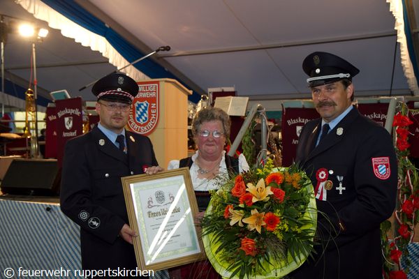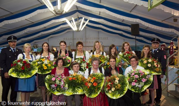 Im Festzelt war es wiederum der Vorstand, der Fahnenmutter Christine Ebenbeck mit den Festdamen, den Festausschuss, eine große Zahl von Ehrengästen, den Patenverein Hainberg-Neukirchen und den Bruderverein Indersbach willkommen hieß. Dazu gaben die weiteren Feuerwehren der Großgemeinde, KBI Theo Pichlmaier, KBM Helmut Schaitl, 3. Bürgermeisterin Maria Bellmann und Festdamen früherer Jahre den Ruppertskirchnern die Ehre.
