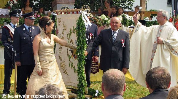Nach einer Rocknacht im Zelt am Freitag und einem Ehrenabend am Samstag (Bericht folgt) stand am Sonntag ein festlicher Gottesdienst mit Segnung der restaurierten Fahne aus dem Jahr 1931 und der Erinnerungsbänder im Mittelpunkt. 75 Vereine aus nah und fern, darunter die Feuerwehr Hainberg-Neukirchen als Patenverein und die Kameraden aus Indersbach als Bruderverein, gaben den Ruppertskirchnern die Ehre und feierten kräftig mit. In der langen Reihe der Uniformen setzten Festdamen und Fahnenmutter in herrlichen Roben mit ihren Begleitkindern, Trachtler, Schützen, Gartler und Sportler bunte TupferMöge St. Florian ein guter Fürsprecher sein“