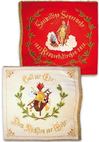 „Wunderschön ist sie geworden“, freuten sich Mitglieder und Ehrengäste samt Feststaat über das Werk von Fahnenstickerin Gabi Ungnadner. Als Vorlage hatte die alte Fahne der Wehr aus dem Jahr 1931 gedient. Die Vorderseite ziert ein Florian, auf der Rückseite sind mit Helm, Koppel, Signalhorn, Axt, Leiter und Schlauch Einsatzattribute im Eichenlaubkranz gestickt. Zur Finanzierung der Neuanschaffung wird die Vorstandschaft in den nächsten Tagen bei einer Haussammlung um Spenden bitten.