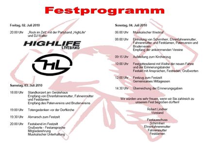 Freitag 02.07.2010: "Rock im Zelt" Samstag 03.07.2010: "Festabend" Sonntag 04.07.2010: "Fahnenweihe"