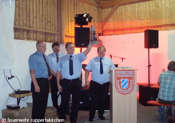 Ehe der Abend in den gemütlichen Teil mit Musik, Kuchenbüfett, Barbetrieb und Freibier überging, war es noch Kommandant Georg Stadler, der im Namen des Festausschusses den unermüdlichen Einsatz von Vorstand Lindner mit einer Florianfigur belohnte. - cmRottaler Anzeiger vom 25.08.2010 www.pnp.de