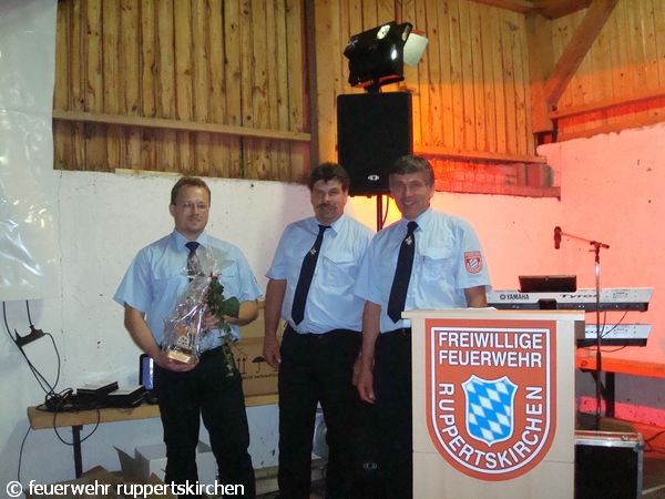 Natürlich gehörten auch Ehrungen zu diesem Abend. Zunächst wurde Anna Eberl, Fahnenmutter des Festes von 1977, nun offiziell mit Urkunde, Blumen und herzlichem Beifall zur Ehrenfahnenmutter ernannt. Weil trotz der Festvorbereitungen auch die Ausbildung nicht zu kurz kam, durften KBI Pichlmaier und KBM Helmut Schaitl Leistungsabzeichen an Franziska Büchner, Franziska Kreipl, Simon Glück, Sebastian Hofer, Manuel Lindner (alle Stufe 1), Caroline Büchner, Theresa Kreipl, Nathalie Wagner, Johannes Eder, Andreas Heller, Christian Reichl und Stefan Noneder überreichten. Vorstand Lindner und Kommandant Georg Stadler bedankten sich bei Theo Henghuber für 25 Jahre Mitgliedschaft.