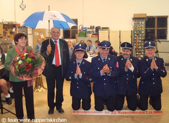 Ruppertskirchen. Mit großem Aufgebot erschien der Festausschuss der Freiwilligen Feuerwehr Ruppertskirchen vergangenen Samstag beim 2. Bürgermeister des Marktes Arnstorf Johann Brunner in Schröttendorf. Sie baten den Bürgermeister offiziell um die Übernahme der Schirmherrschaft für das 125-jährige Gründungsfest, das im kommenden Jahr vom 2. bis 4. Juli 2010 groß gefeiert wird. Mit Marschmusik wurde in den Schremer-Hof eingezogen, wo 2. Bürgermeister Johann Brunner und seine Frau Anneliese die Feuerwehr bereits erwartete. Vorstand Robert Lindner trug sogleich in Versform das große Anliegen der Jubelwehr vor und bat um eine freudige Antwort vom Schremer Hans, wie er in Ruppertskirchen genannt wird . Ganz so einfach sollte es aber für Vorstand Robert Lindner, seinen Stellvertreter Alois Gerwallner, Kommandant Georg Stadler und stellvertrenden Kommandant Anton Stadlbauer nicht sein: sie mussten auf dem vorbereiteten spitzen Holzscheidl kniend gemeinsam eine Aufgabe lösen und nochmals kräftig bitten, bevor Johann Brunner die Feuerwehrführung erlöste und sein freudiges " Ja" aussprach. Der Schirmherr, selbst schon 43 Jahre Mitglied der Wehr, bedankte sich für die Anvertrauung der Schirmherrschaft und wünschte dem Fest einen erfolgreichen und schönen Verlauf. Natürlich durfte ein weißblauer Schirm mit Aufdruck und eine Brotzeitplatte zur Stärkung für die bevorstehende Aufgabe des Schirmherren nicht fehlen, ebenso gab es als Dank einen prächtigen Blumenstrauß für die Ehefrau Anneliese Brunner. Anschließend verbrachte man bei bester Bewirtung in der festlich gedeckten Werkstatt einen gemütlichen und geselligen Abend mit Blick auf das bevorstehende 125-Jährige Jubiläum.